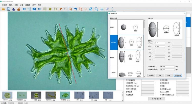 可测量藻群体面积、浮游生物个体面积,藻类直径,藻丝、鞭毛长度以及分枝角度
