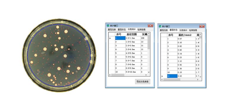 显示菌落统计结果,包括菌落总数、菌落形态、分类统计。菌落形态包括每个菌落的编号、位置、等效直径、周长、面积、圆度、短径和长径。分类统计根据菌落的直径把菌落分成25个类别,用户可以直观地查看每个类别的菌落总数。