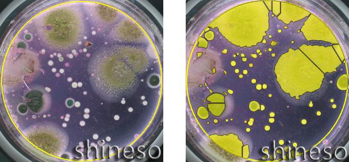 色泽各异的细菌、霉菌、放线菌,尤其是霉菌菌落,质地松散,中心与边缘色泽变化大。迅数基于多层水平集框架模型分割算法,能较好解决多菌混杂的统计精度。