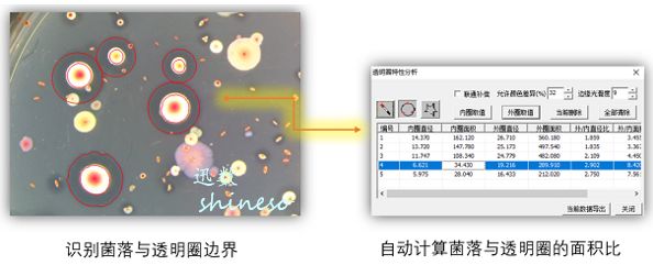 微生物平板初筛常通过肉眼观察突变菌落形成的“透明圈、变色圈、生长圈、水解圈、溶磷圈、排油圈、抑菌圈、溶钙圈、溶血圈”的大小、深浅来人为判断。迅数双圈分析模块提供了定量化的分析手段:通过精确测量外圈直径和菌落直径,自动计算二者面积比和直径比。根据比值的大小自动排序,定位出相应的菌落。可用于抗生素、酶制剂、有机酸产生菌,表面活性剂、石油、农药降解菌的筛选。