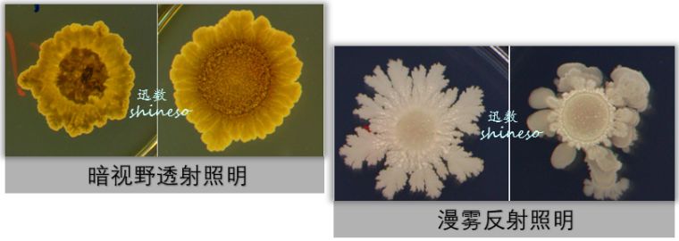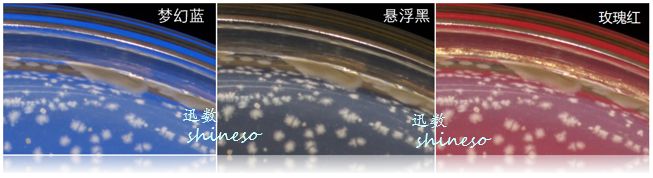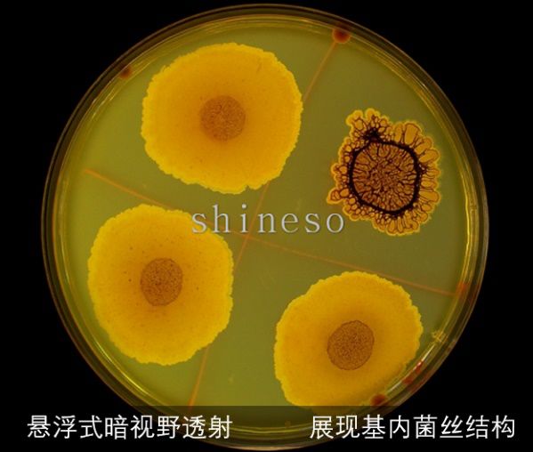 复式悬浮式暗视野照明由暗视野轮廓光与逆射光混合构成。使平皿中央到边缘保持光线的均匀性,形成宇宙般幽蓝深邃背景,凸显菌落色泽、轮廓与结构。