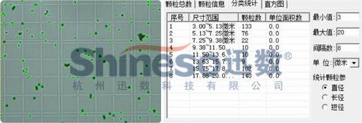 自动统计:自动颗粒计数,并显示每个颗粒的面积、周长、直径、圆度等形态参数