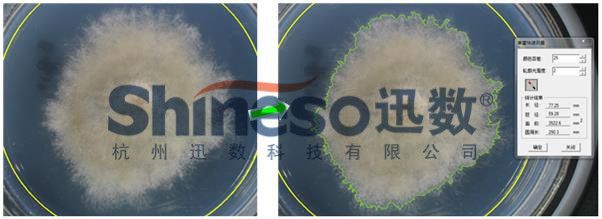 传统的菌丝生长速率、霉菌生长量、菌丝生长抑制率、室内毒力测定等霉菌研究实验采用十字交叉法测量菌落生长直径。由于多数霉菌菌落蔓延、疏松、边缘发散不规则,测量的人为误差大,效率低。迅数“霉菌一键测量”模块,只需用“魔棒”在菌落边缘点击一次,即可瞬间测出大霉菌的面积、周长、长径、短径。