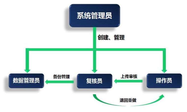 “系统管理员、数据管理员、操作员、复核员”四重系统架构,分设职能与权限,确保数据信息的安全、完整和真实。