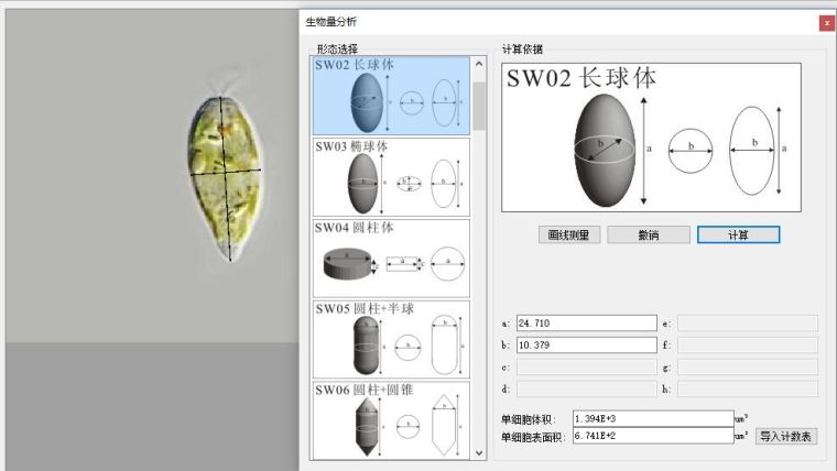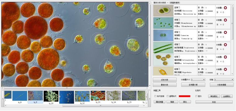系统提供了专门的显微分析工具。透明数字标尺可在不同物镜倍率下实现显微测量;生物量分析模块则汇聚了大量藻类几何模型,通过显微测量数据,自动计算藻的生物量。