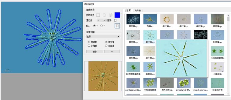 ✦ 多维渐进相似藻搜索:自动、智能的藻细胞图形识别工具,3-5秒即实现:侦测未知藻细胞轮廓、提取特征信息、大数据匹配,精确找出形态相近的可能藻类,“优先选择”项同步展现最相近的常见藻类。