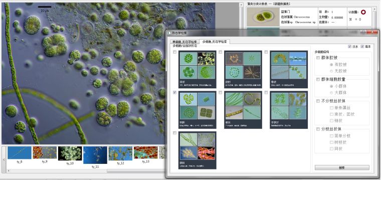 ✦ “典型组合联想”形态学检索:用图形语言、组合联想、并结合细胞或群体的结构特征,实现精确、快捷的形态学检索。具备:特征多选、淡水、海洋分库、浏览方便等特点,使得初学者能快速掌握。