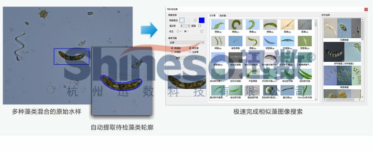 全新设计的软件架构,结合精美的浮游生物大数据,满足用户对浮游生物快速智能鉴定、分析、计数的需求。**采用迅数专利图像技术-“多维渐进相似藻搜索”,仅需3秒即可从海量图库中把最相似的藻找出来,同时具备:多层聚焦、超视野拼接、生物量分析、链状体和胶被群体的子细胞计数、单细胞微藻自动计数等多种浮游生物分析功能。