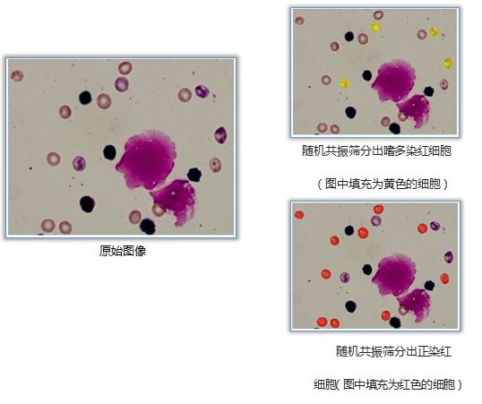 通过事先分别学习一组典型的“正染红细胞”、“嗜多染红细胞”,系统自动记忆细胞特征,经模式识别,快速捕捉预定数量的红细胞,并自动计算出“嗜多染红细胞”占比。