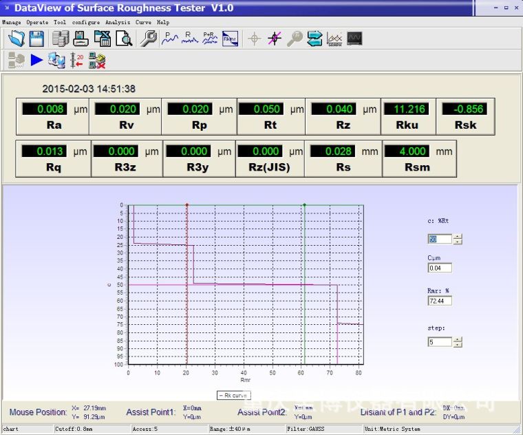 | 测量参数 | Ra,Rz,Rq,Rt,R3y,Rsm,Rp,Rv,RzJIS,R3z,Rsk,Rku,Rmr |