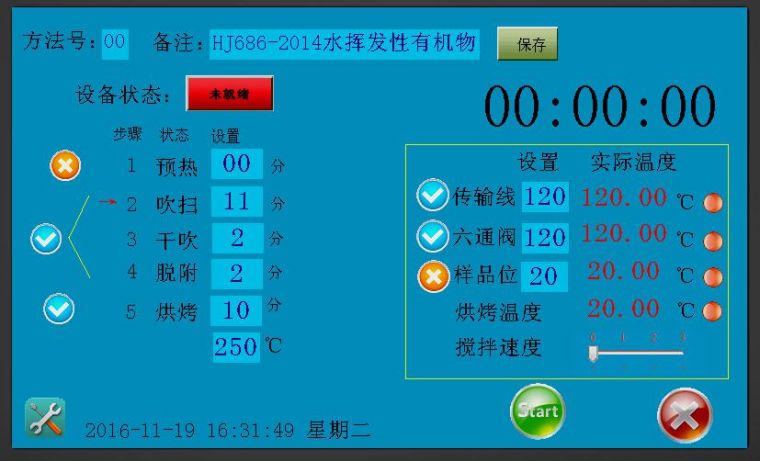 预热:对样品预加热到需要的温度,先在屏幕上右侧设置好传输线、六通阀、样品位的温度(常温吹扫无需设置温度),并打√或×