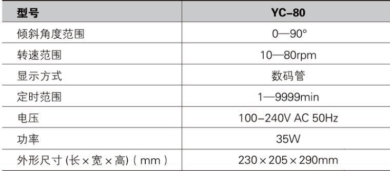 YC-80旋转培养混合器用于样品的组织培养,萃取,测定沉降率(包括各种血样的化学测定),如:血样混合、放射免疫、葡萄糖、蛋白质、DNA、细胞、尿液、酶等湿化学分系,在生化、生物、细胞、免疫、化学、动植物分析、临床实验等诸多方面都有广泛应用。其主要特点是能够匀速地长时间连续混合,它便于操作,转盘的倾斜度可任意调节。它还可根据需要放置在恒温箱中。