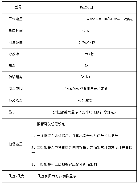 DA2000J风速报警仪由风速传感器、主机、传输电缆等附属装置构成。