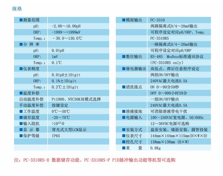 ■ PC-3310具两路0/4~20mA输出对应设定pH/ORP、Temp.