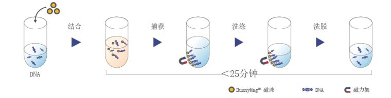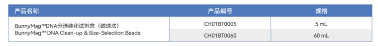 BunnyMag™ DNA分选纯化试剂盒(磁珠法)基于SPRI(固相载体可逆化固定法)顺磁技术,通过调节磁珠和样本的体积比,可以选择性地结合不同大小的核酸片段,满足核酸不同长度范围的选择需求,适用于高通量测序中理想大小DNA片段的纯化和筛选。本产品兼容各品牌DNA、RNA建库试剂盒,适用于各类下一代测序平台。