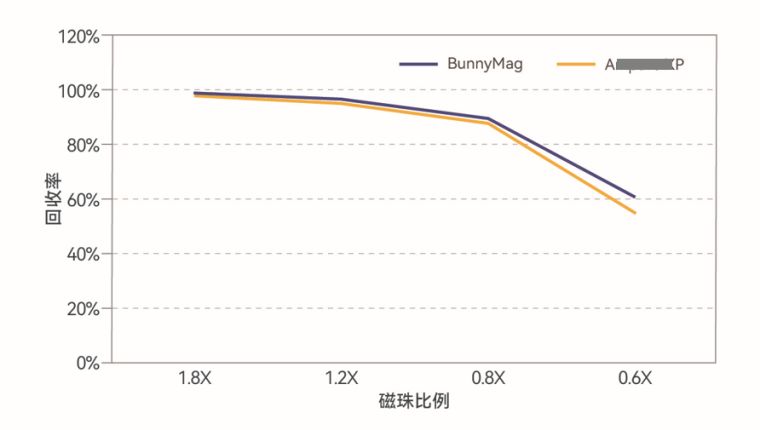 使用不同比例的BunnyMag™磁珠与Ampure XP磁珠对相同量的DNA片段进行纯化回收,BunnyMag™磁珠的回收效果与Ampure XP磁珠高度一致。