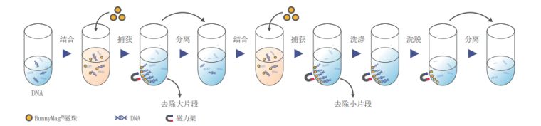BunnyMag™ DNA分选纯化试剂盒(磁珠法)采用高性能磁珠和独特缓冲液体系,通过调整磁珠与样本的比例,可实现100bp-10kb的DNA片段的分选和纯化。