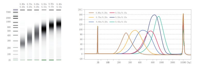 使用BunnyMag™ DNA分选纯化试剂盒(磁珠法)对初始大小为200-1500bp DNA片段,按上表的条件通过两步法磁珠分选、纯化,进行琼脂糖凝胶电泳验证所得DNA片段大小,以及用片段分析仪进行片段分析,BunnyMag™ DNA分选纯化试剂盒(磁珠法)可达到精准的片段分选效果。