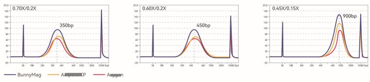 分别使用BunnyMag™ DNA分选纯化试剂盒(磁珠法)、同类产品A***P和A***n磁珠,进行DNA片段分选,在不同分选比例条件下,BunnyMag™磁珠在片段分选效果上与竞品表现出高度一致性。