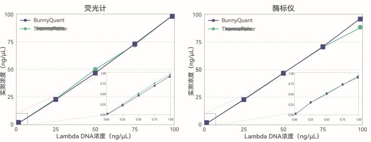 使用本检测试剂盒和Th***同类产品,对10个已知浓度的dsDNA标准品(Lambda DNA)进行定量,分别使用荧光计和酶标仪检测,本产品检测结果与竞品公司同类产品具备同等性能效果。