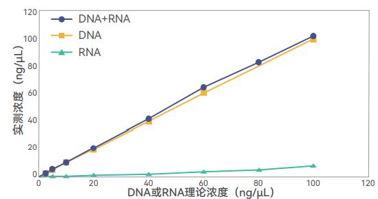 使用本检测试剂盒对DNA、RNA、DNA和RNA混合物(1:1)进行定量。结果显示,本产品对dsDNA具有高度的结合特异性,而不定量RNA。