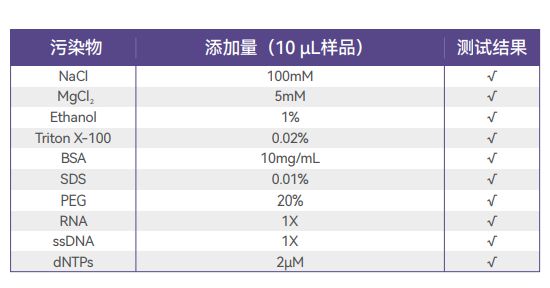 耐受性好:耐受较高浓度的盐、尿素、乙醇、氯仿、去垢剂、蛋白 或琼脂糖等常规污染物;
