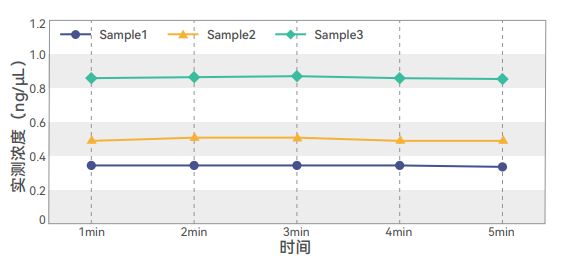 使用本检测试剂盒对3个不同浓度的dsDNA样本,从加样1min开始,每隔1min检测一次,记录5min内样本的浓度变化情况。本产品结合dsDNA速度快,在1min内即可达到饱和。