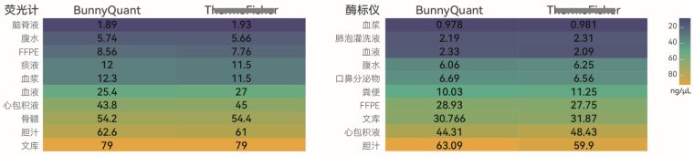 使用本检测试剂盒和Th***同等产品针对不同样本类型的DNA进行定量,分别利用荧光计和酶标仪检测,BunnyQuant™ dsDNA HS检测试剂盒与竞品公司同类产品定量结果高度一致。
