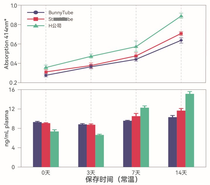 将血液样本分别采集至3个品牌保存管中,室温放置0天、3天、7 天、14天后对比样本溶血情况及cfDNA产量,BunnyTube™游离DNA样本保存管能够有效抑制溶血,且提取的cfDNA产量稳定。