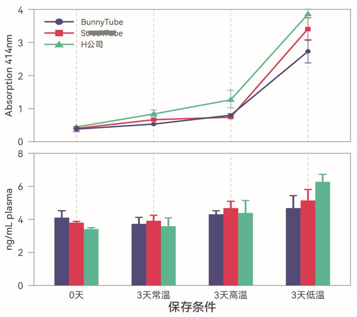 将血液样本分别采集至3个品牌保存管中,3天常温(25℃)、高温(37℃)、低温(4℃)运输后对比样本溶血情况及cfDNA产量,BunnyTube™游离DNA样本保存管能够耐受不同运输温度,具备更好的抗基因组核酸释放能力。