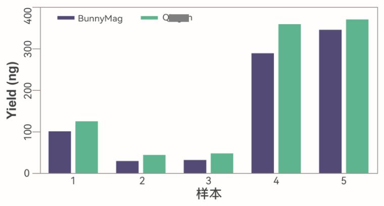 使用本提取试剂盒与Q**n同类产品分别对血浆样本进行微生物游离DNA提取,检测微生物游离DNA产量。BunnyMag™血浆病原游离DNA提取试剂盒提取获得的微生物游离DNA产量与同类竞品试剂盒一致性高。