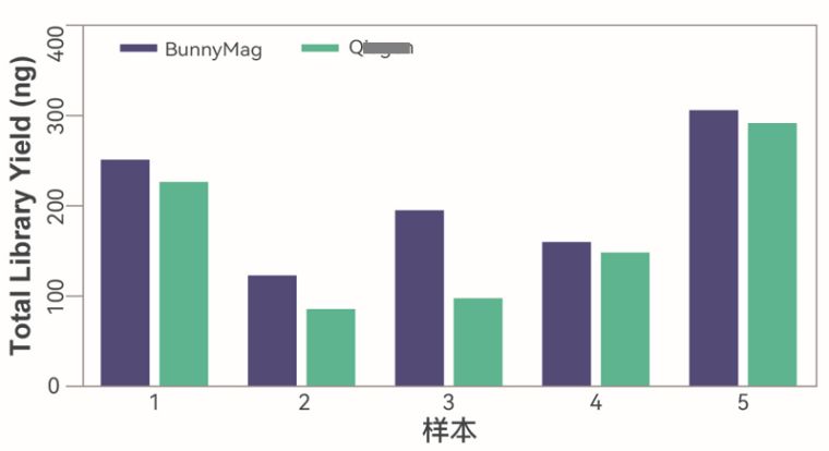 使用本提取试剂盒与Q**n同类产品分别对血浆样本进行微生物游离DNA提取,并以等质量进行文库构建。BunnyMag™血浆病原游离DNA提取试剂盒提取的微生物游离DNA文库构建得量与竞品表现一致。