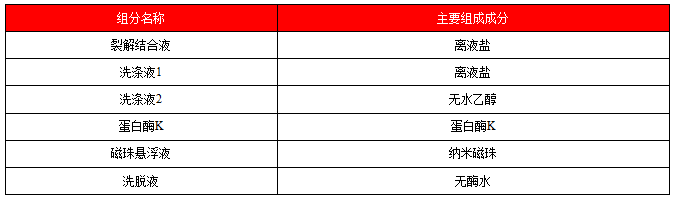磁珠悬浮液和蛋白酶K置于2-8℃保存,其他试剂可室温保存,有效期12个月。