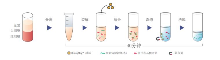 BunnyMag™血浆病原游离DNA提取试剂盒(磁珠法)采用具有独特分离作用的磁珠和独特的缓冲液系统,可从新鲜或冷冻血浆中快速提取病原游离DNA,轻松实现低浓度的痕量核酸提取。