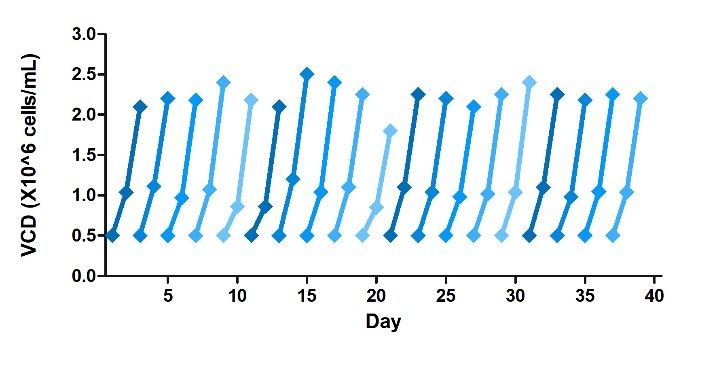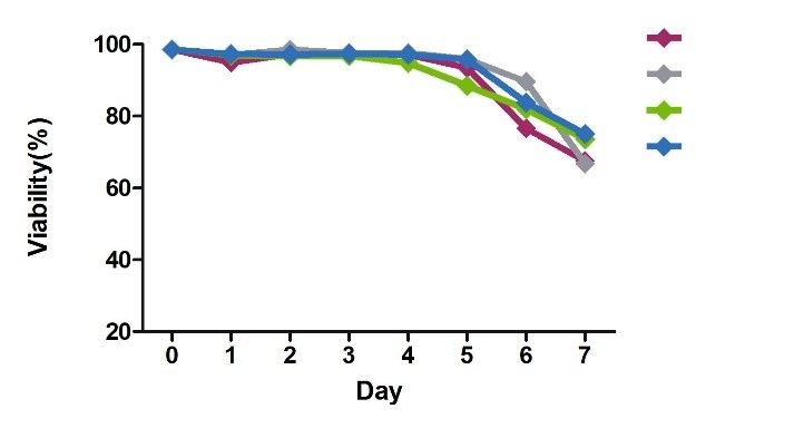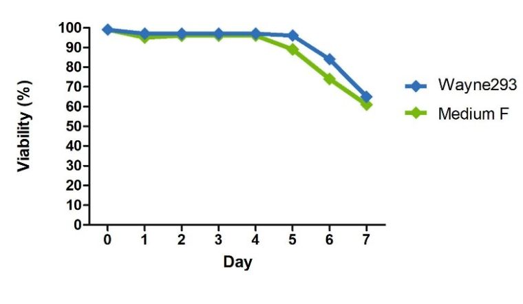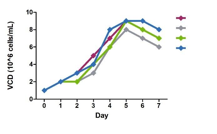 不同HEK293细胞在Wayne293™的生长情况。Batch,125mL摇瓶,工作体积30mL,ф25mm,125rpm,湿度75%,5%CO2,37℃培养7天。