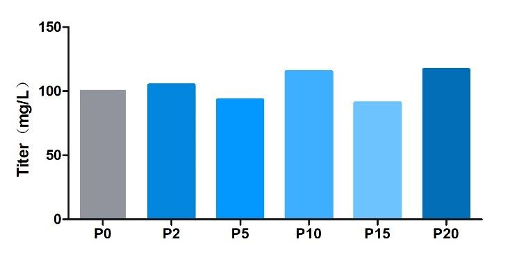 F细胞在Wayne293™中连续传代的生长及瞬转表达情况。125mL摇瓶,工作体积30mL,ф25mm,125rpm,湿度75%,5%CO237℃培养;隔天传代,共传代20次,每5代冻存;传代结束后统一复苏,按说明书标准方法转染同一个IgG质粒,检测瞬转表达量。