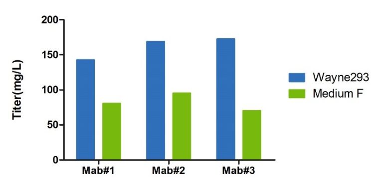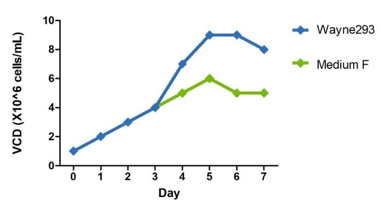 HEK293 F 细胞在Wayne293™及其他商品化培养基中转染后的生长及表达情况。对照:Medium F为供应商G 的HEK293瞬转培养基;125mL摇瓶,工作体积为30mL,ф25mm,125rpm,湿度75%,5%CO2,37℃培养;按说明书标准方法分别转染三个表达不同IgG的质粒,继续培养7天。