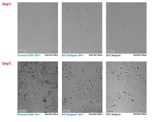 激素敏感的MCF-7细胞使用DCC吸附处理前后FBS培养测试结果。组1(未处理FBS_IGF-1):能刺激MCF-7细胞快速增殖;组2(吸附FBS+IGF-1):MCF-7细胞按正常速度生长,组3(未添加IGF-1的碳吸附FBS):MCF-7细胞生长缓慢。寄出培养基:MEM(无酚红,含NEAA及谷氨酰胺)。添加物:0.01mg/mL重组IGF-1,未处理/碳吸附FBS终浓度10%。气体:95%空气,5%CO2,温度37℃。结果显示,碳吸附FBS中的胰岛素及雌激素含量均被有效降低。