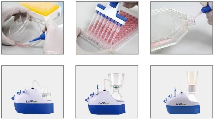双功能设计,能用以抽吸培养皿、微孔盘等培养液或离心完后之上层液的装置;也可搭配抛弃式漏斗或可重复使用之过滤漏斗,用以纯化组织培养液或缓冲液。