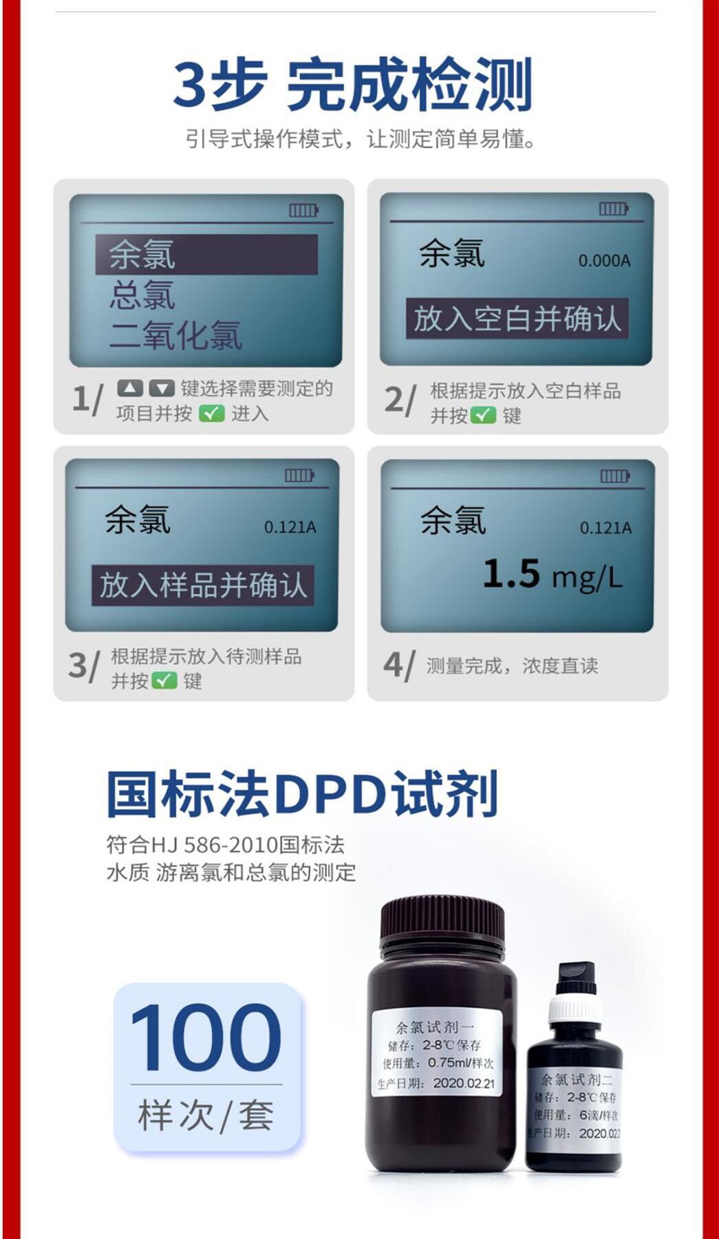 纯中文显示,可以让检测数据更直观的展现,引导式检测模式,降低了学习成本,使用者可以简单快速的测定污染物。