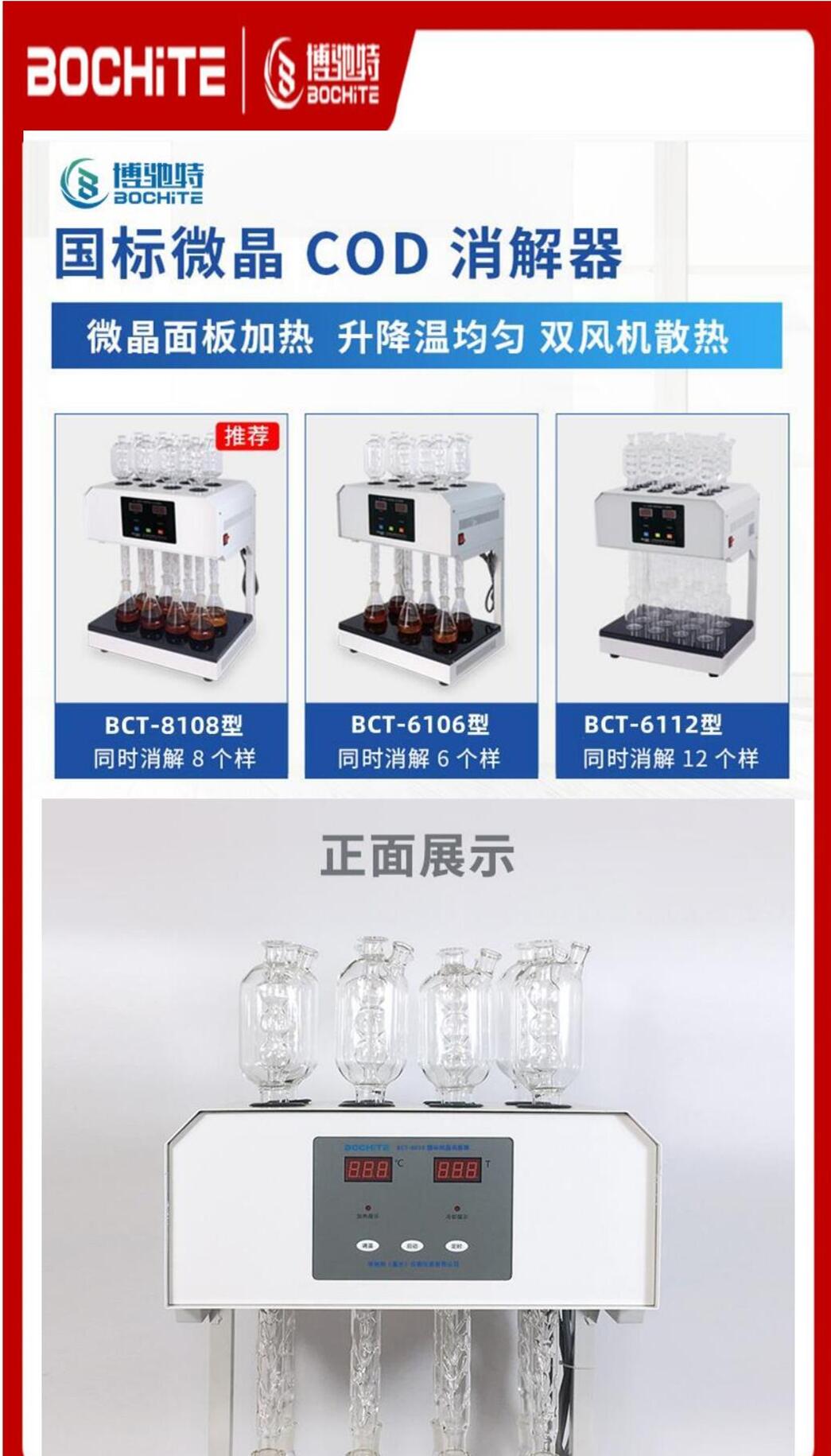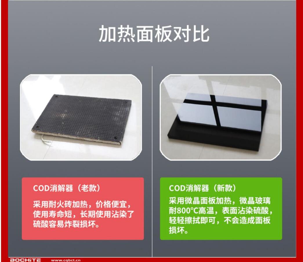 仪器的化学溶液配制、操作和COD的计算完全遵照(HJ828-2017)重铬酸盐法,低于50mg/L的COD水样可通过稀释滴定剂和氧化剂来提高精确度,高于700mg/L的COD水样,可以通过水样的比例稀释来完成测定。