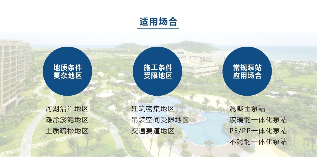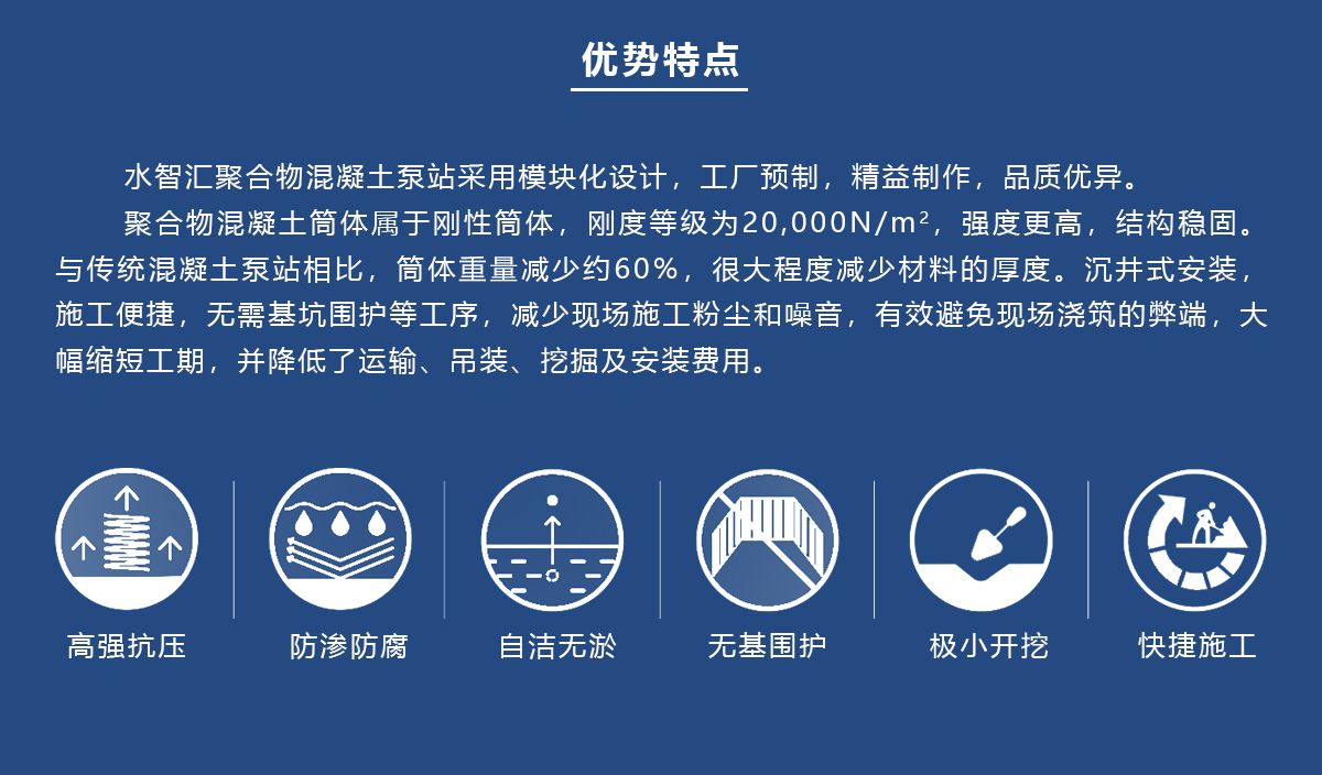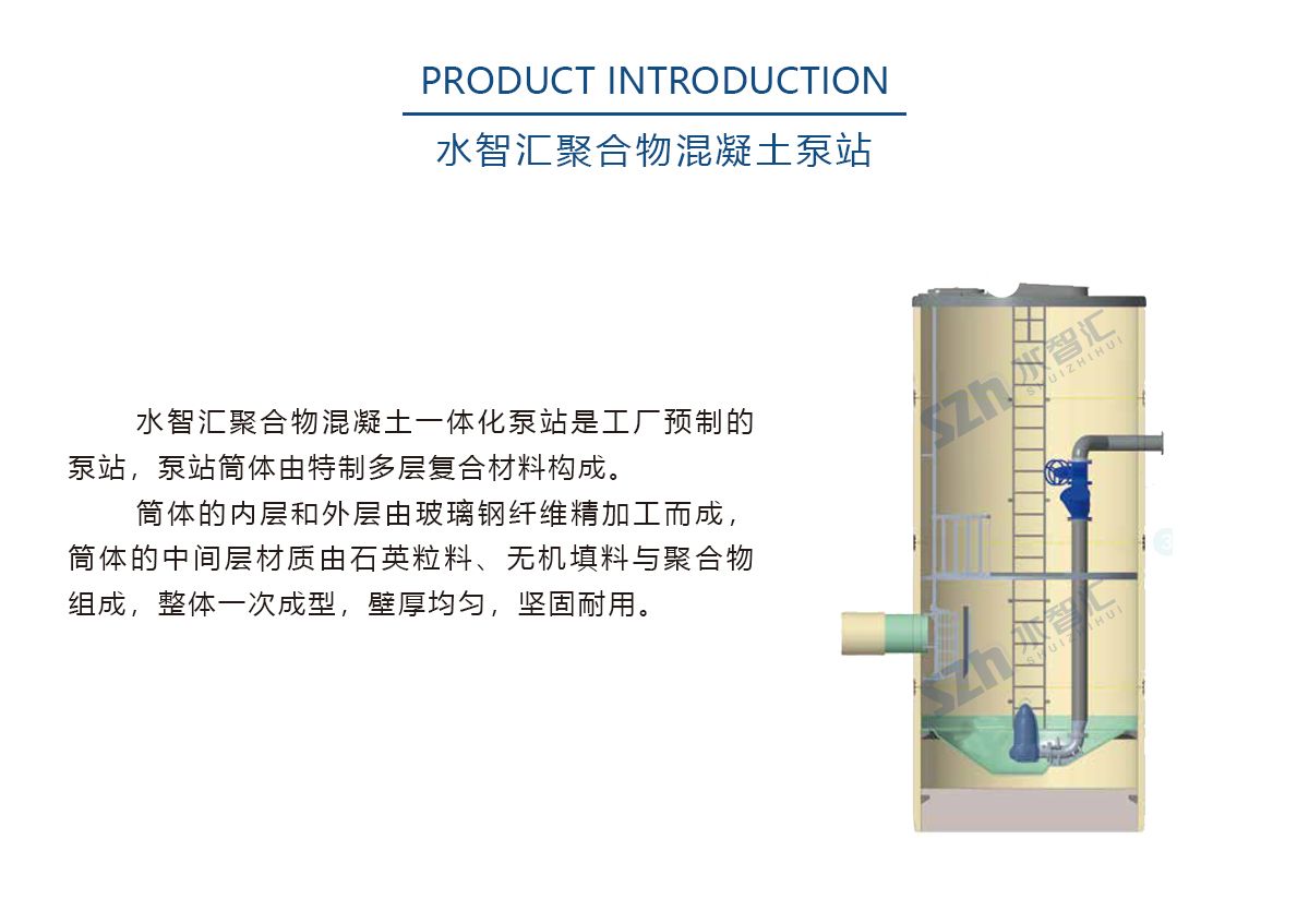 聚合物混凝土泵站多个核心结构部件由安全可靠、绿色环保的聚合物混凝土构成,通过固化体系定向回收技术,解决泵站大型结构部件回收再利用的难题。泵站采用自主研发的自清洁螺旋装置底座,能够实现无额外动力自动清洁作用。泵站的潜水螺旋离心泵采用永磁同步电机,具有效率高、体积小、功率因数高等多个优点;并采取定制化的精细设计,确保永磁体不退磁;再搭配高性能控制器,系统效率高。泵站具备CED流态模拟分析和FEA有限元分析,优化筒体内部流道,改善流态,改善筒体应力分布,确保筒体在泵站全寿命周期内安全、可靠地运行,广泛应用于河湖沿岸地区、滩涂淤泥地区、土质疏松地区、交通要道地区、建筑密集地区等场景。