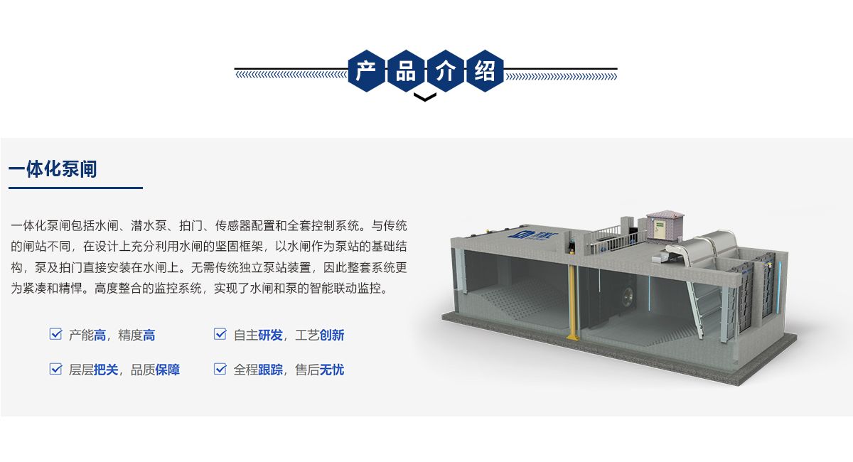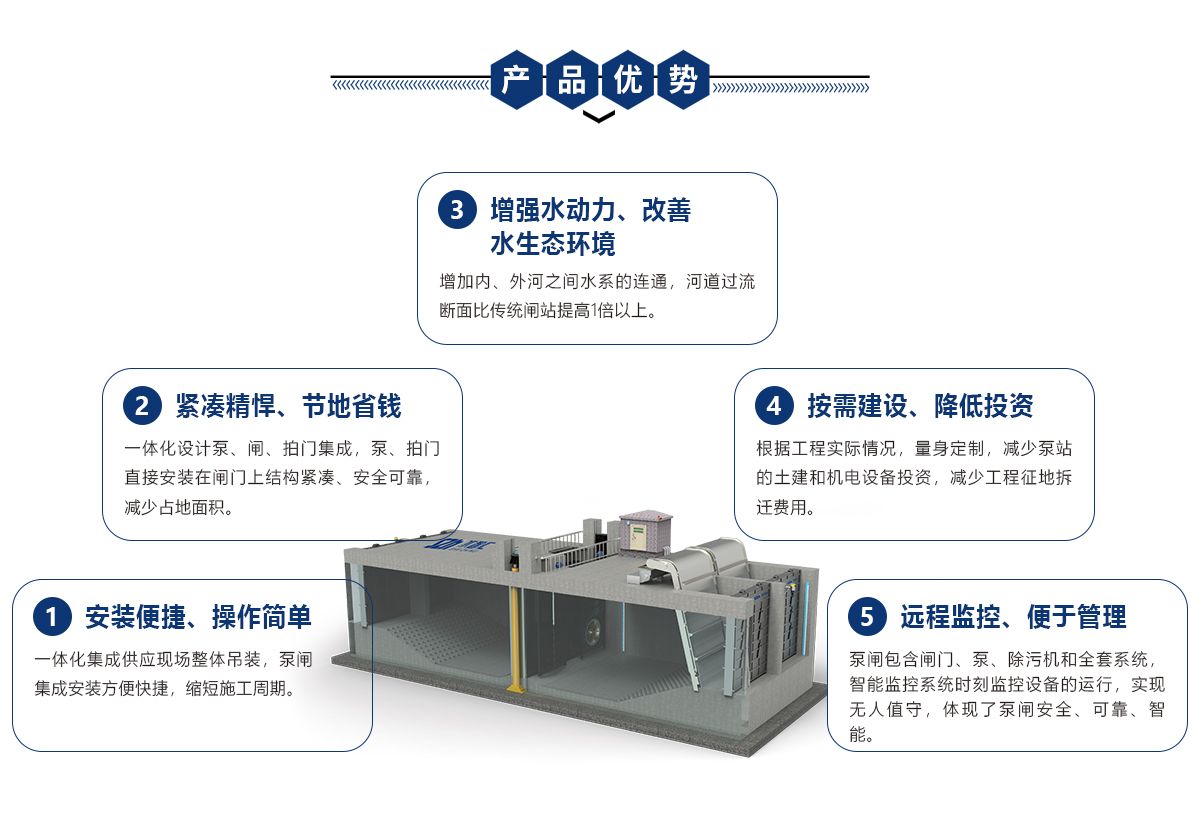 一体化泵闸是一种创新性的引排功能建筑物,它由水闸、闸门泵、拍门、传感器配置和全套控制体系等构成,适用于中低扬程、不同圩区间的闸站工程,在我国城市和乡镇内河排涝、调水蓄水、河道治理以及农田水利工程中使用非常广泛。将独特的泵与闸门合二为一的结构,集成化程度高,占地面积小,使闸站整体布局变得简洁、紧凑、合理。一体化泵闸配备强大的液位监测和运行控制系统,使泵闸具备应对防涝、防洪、防旱、增强水动力、内外河水体交换等全方位的运行功能。