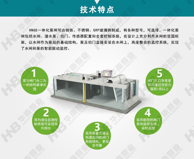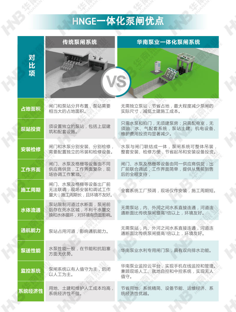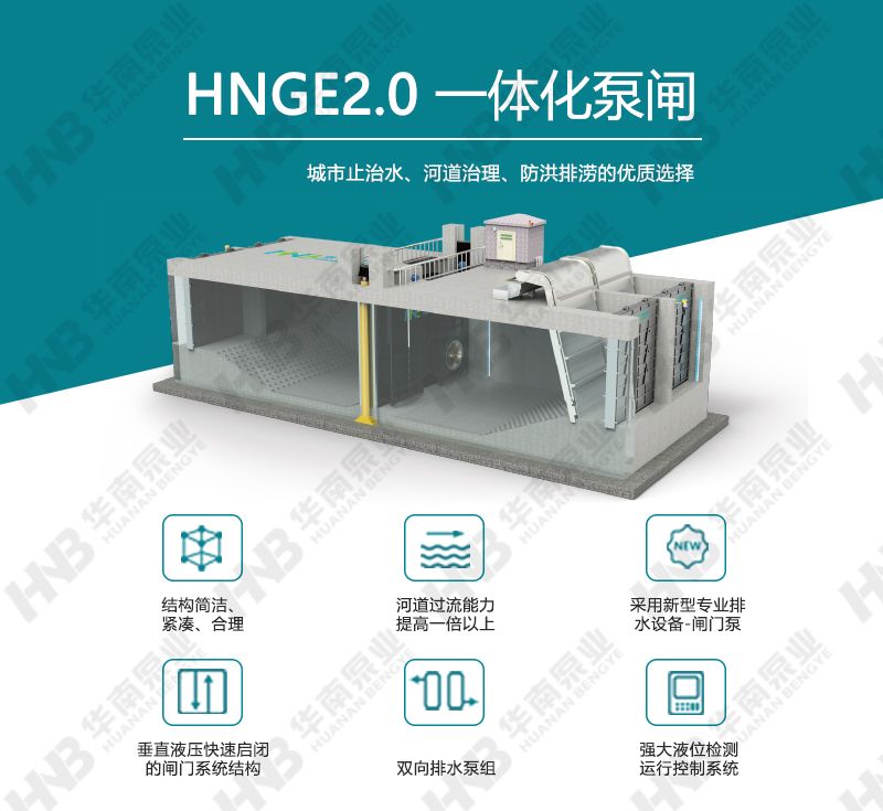 一体化泵闸是一种创新性的引排功能建筑物,它由水闸、闸门泵、拍门、传感器配置和全套控制体系等构成,适用于中低扬程、不同圩区间的闸站工程,在我国城市和乡镇内河排涝、调水蓄水、河道治理以及农田水利工程中使用非常广泛。将独特的泵与闸门合二为一的结构,集成化程度高,占地面积小,使闸站整体布局变得简洁、紧凑、合理。一体化泵闸配备强大的液位监测和运行控制系统,使泵闸具备应对防涝、防洪、防旱、增强水动力、内外河水体交换等全方位的运行功能。