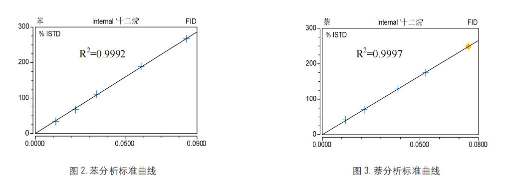 2.标准曲线测定:根据煤焦油中苯和萘的含量,准确称取苯和萘0.01g、0.02g、0.03g、0.04g和0.05g(精确到0.1mg),准确称取0.030g正十二烷(精确到0.1mg),