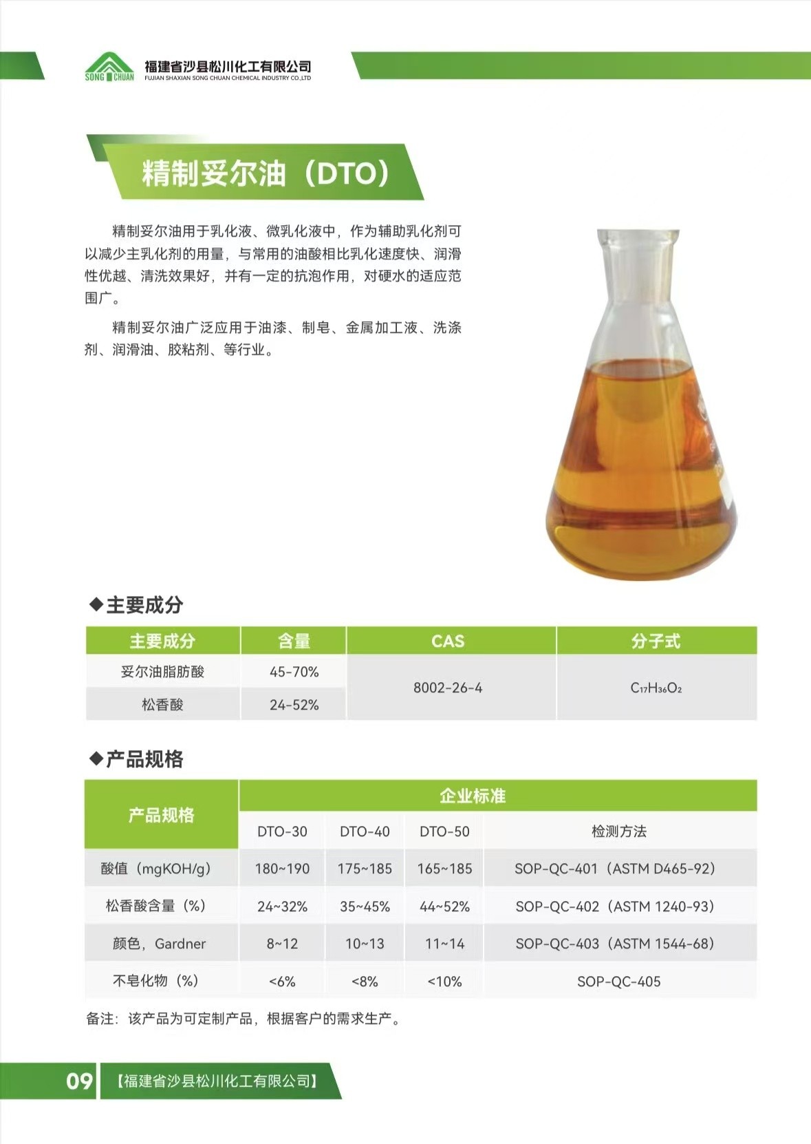 精制妥尔油 是由硫酸盐纸浆厂副产品---粗妥尔油经蒸馏而得的产品,是松香酸和脂肪酸的混合物。它具有松香和脂肪酸的双重特性。它是从可再生的植物资源中-松树中获得的蒸馏妥尔油。妥尔油在金属加工液中用于乳化液、微乳液中,作为辅助乳化剂可以减少主乳化剂的用量,与常用的油酸相比乳化速度快、润滑性优越、清洗效果好并且有一定的抗泡作用,对硬水的适应范围宽,有良好的抗酸败性。