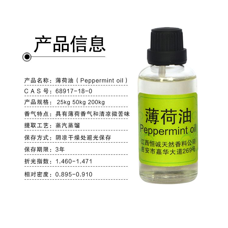 【性状】无色或淡黄色澄明液体。呈强烈薄荷香气和清凉适度的苦味。对强酸和强碱不稳定。易溶于乙醇,大多数非挥发油,矿物油和丙二醇,不溶于甘油。