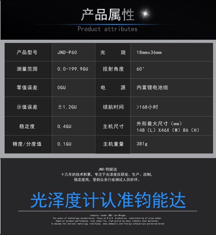 JND-P60光泽度计是参照标准ISO 2813和GB/T9754设计制造的光泽度测量仪器.技术参数符合ASTM D2457、ASTM D523及GB/T13891 GB/T7706、GB/T8807标准中的规定。各项性能指标达到标准JJG 696《镜像光泽度计和光泽度板》计量检定规程中一级工作机要求。