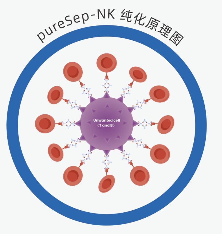 pureSep-NK 通过双抗分子靶向链接红细胞和非目标细胞(T细胞或B细胞等),非目标细胞与红细胞形成细胞团簇复合物经过Ficoll离心沉降,NK细胞保留在上层白膜层,实现快速分离。
