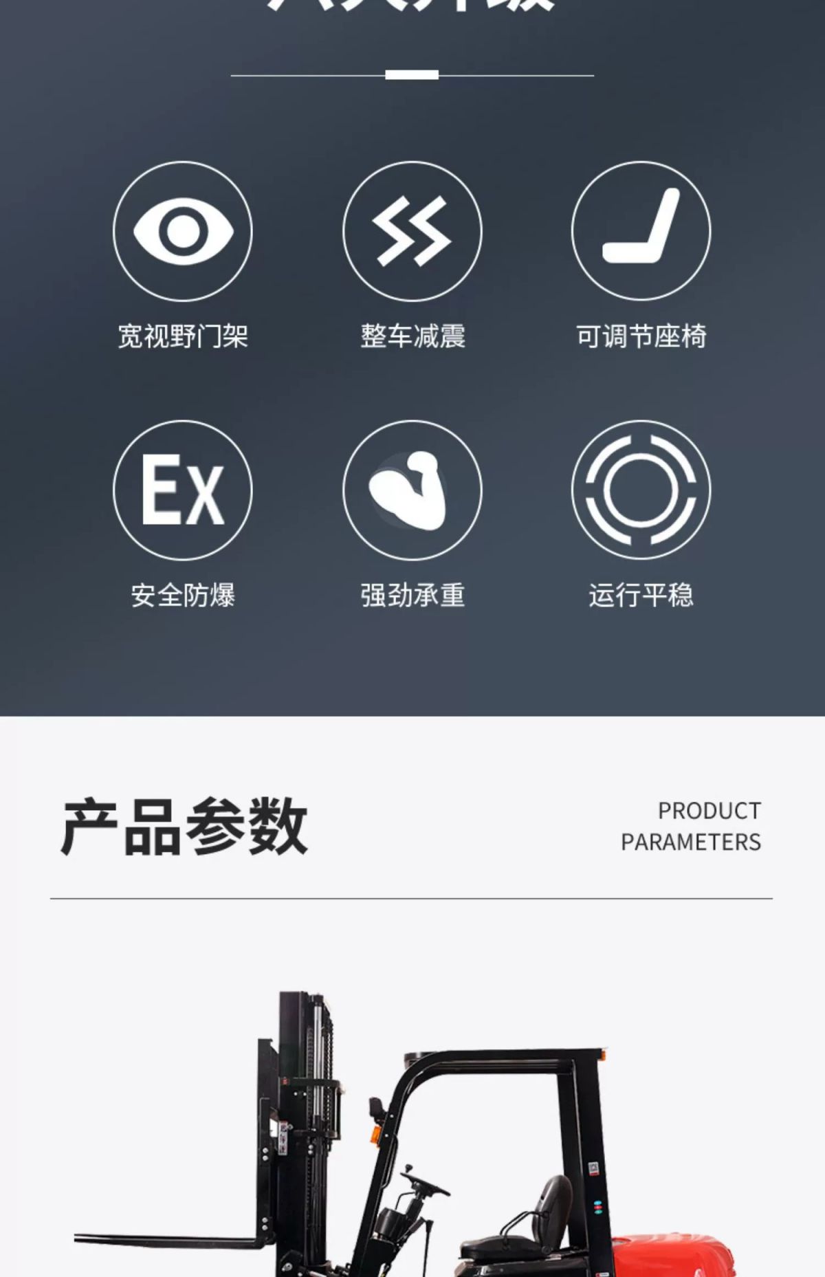 六大升级:宽视野门架、整车减震、可调节座椅、安全防爆、强劲承重、运行平稳